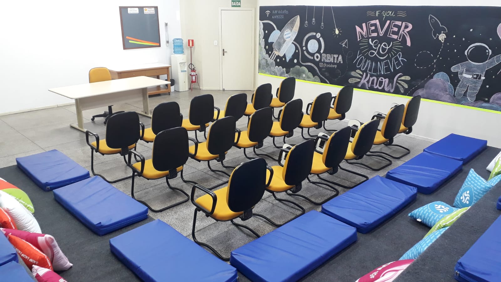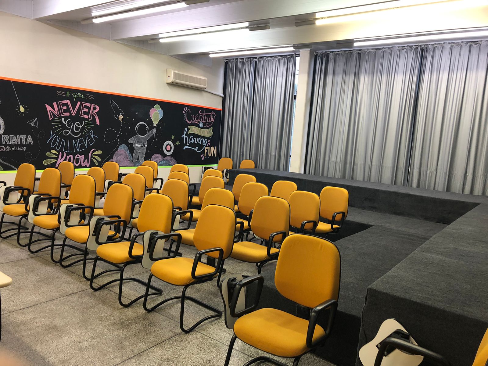 Equipada com: cadeira com braço, climatização, Internet e flip chart